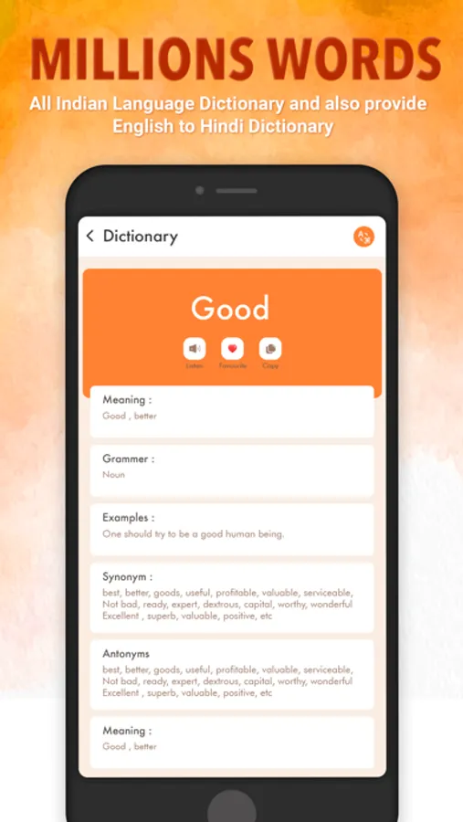 U dictionary is made in india and all country free largest hindi english dictionary with more than 400000 words. You will get each word meaning with full explanation, definition, synonyms, antonyms, word usage, example, and grammar. We provide hindi & english pronunciation as well to help users and speak words. This app has lakhs of english & hindi words which will help you prepare for competitive exams like ACT, SAT , IELTS or TOEFL, CAT, GRE, MAT, SSC, IBPS, Bank PO exams & your daily vocabulary improvement. This app also will help you in spell checking. U Dictionary is the best indian alternative app of Oxford Dictionary.