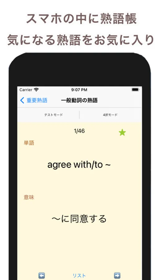 2つのテストモードがあり自分に合ったモードで勉強できます。これらのテストモードでは出題の順番がランダムのため順番で英熟語を覚えてしまう心配はありません。