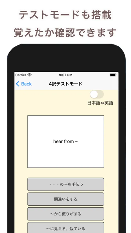 出題方式は日本語から英語、英語から日本語の選択ができ自分に合った勉強方法ができます。
