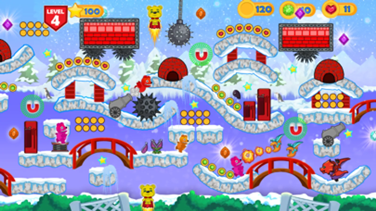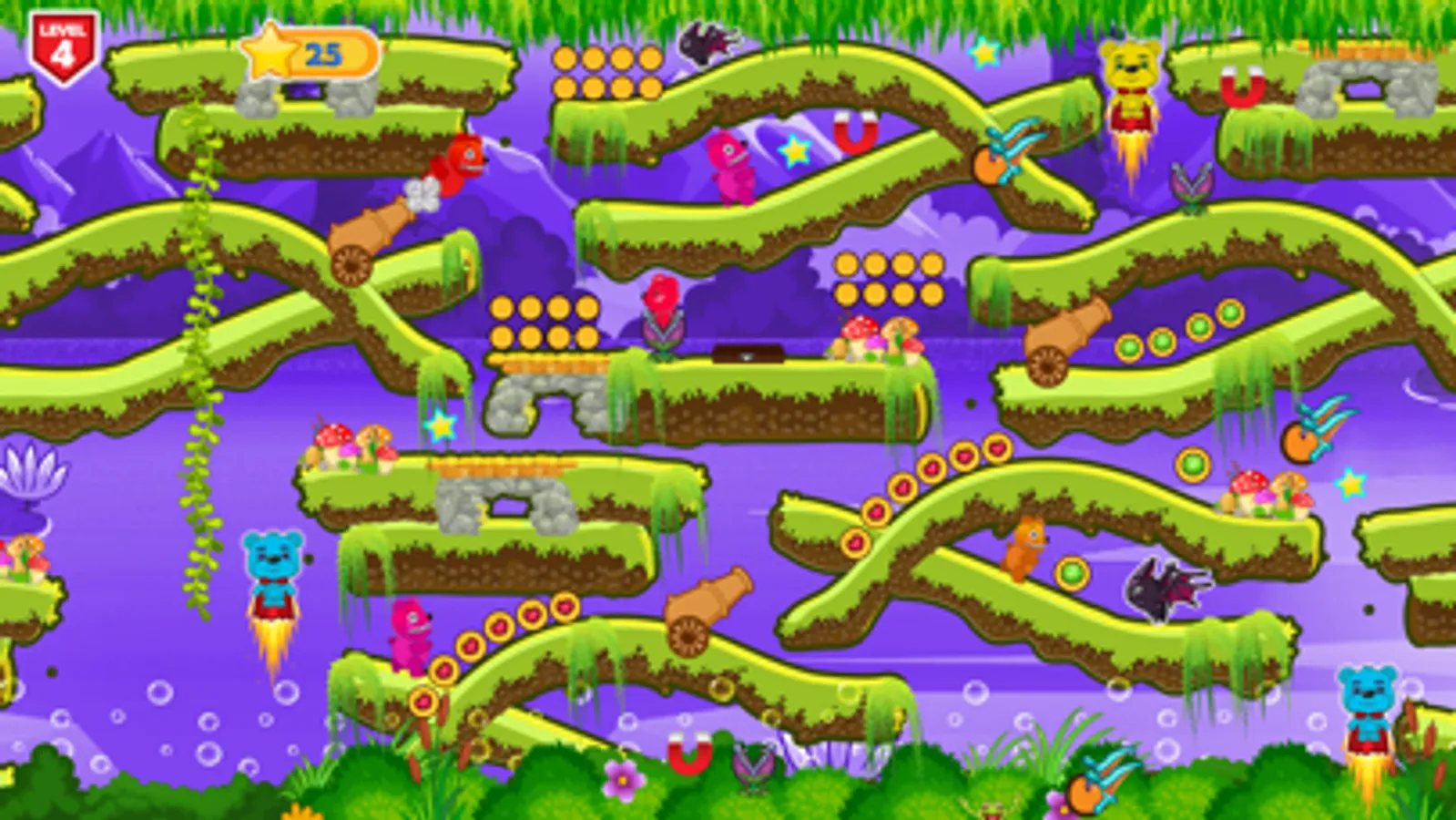 Gummy bear can jump, move to the sides, bend or roll over to avoid bumping into obstacles, hurdles, fences and a lot of objects that will try to stop you from running! How long can you run? Start the dash runner challenge, gummy player running horizontally while tapping the screen to jump There are also many obstacles along the way that the player has to overcome, like baddies, spike , and moving platforms.