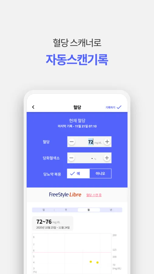 - 직접 입력 뿐 아니라 혈당관리 스캐너를 통해 자동기록 및 관리