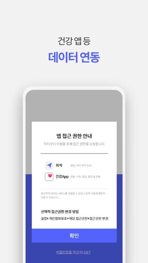※ 애플 헬스 데이터(Apple Health)와 동기화하시면 피트니스 데이터와 신체 측정치를 닥터구디(Dr. Goodi) 앱으로 가져올 수 있습니다.