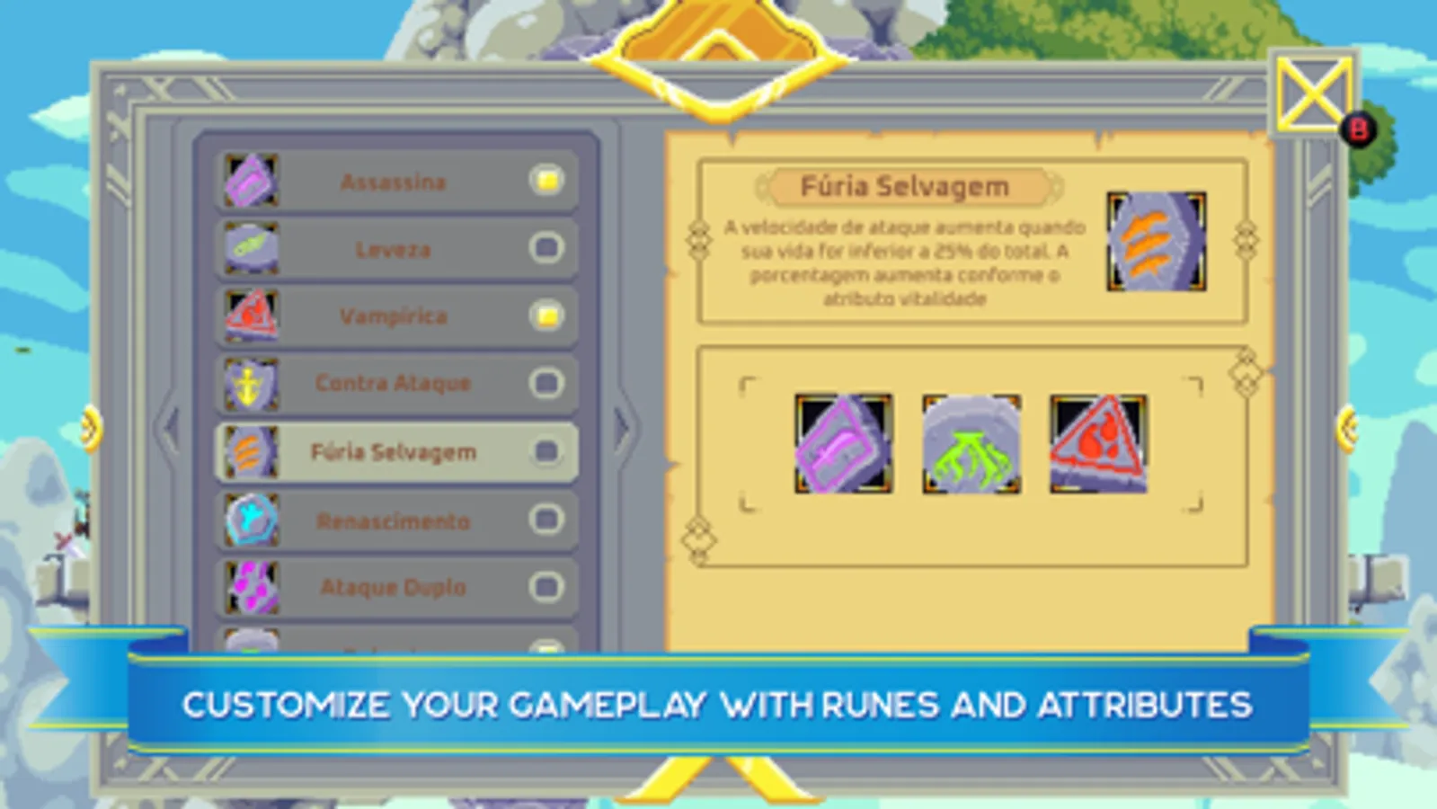 • Customize your gameplay with runes and items! Find runes around the cave that will give your hero extra features. Assemble your build with up to three runes, forge items and set up your character in your preferred style. Choose your strategy and customize your gameplay!