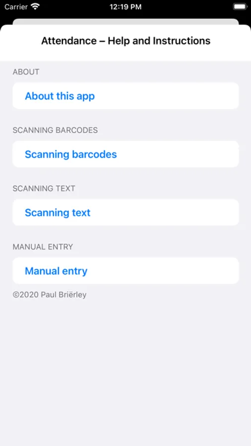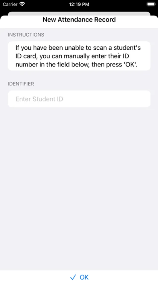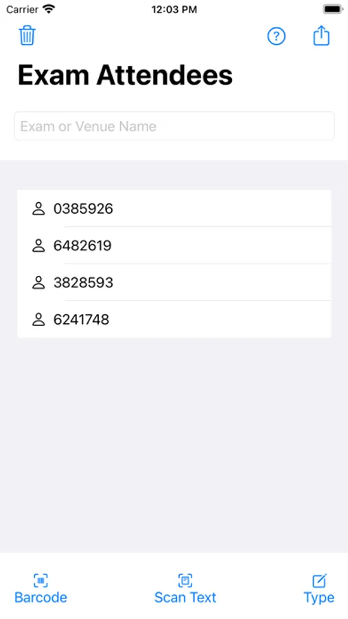 This app allows exam invigilators to take attendance in examinations by scanning the barcode or text on a student's ID, or manually typing in their ID. The resulting list can then be shared as a CSV spreadsheet with the exams office so that they can collate attendance registers.