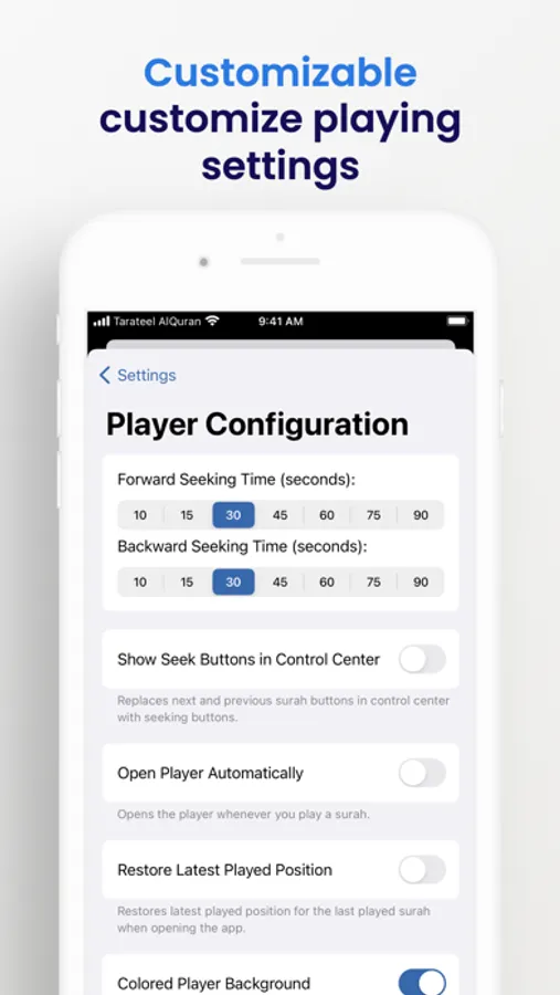 - إمكانية تخصيص إعدادات التشغيل (التكرار، زمن التقدم والتراجع، الإيقاف التلقائي، والمزيد).