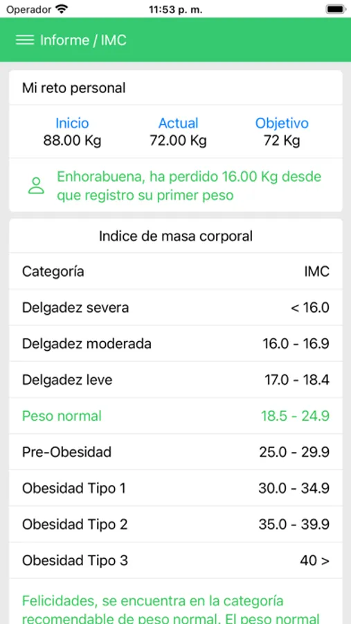 - Report / BMI: Complete report showing your current body mass index and the amount of weight we have lost.