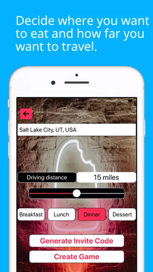 To create a game: as the game creator you need to pick a city that you want to eat in, a radius of how far you would like to travel in that city as well as what type of meal you would like to eat (e.g. breakfast, lunch, dinner, dessert). After you have created your game, an invite code will be saved to your device and you can text that to whoever you would like to join.