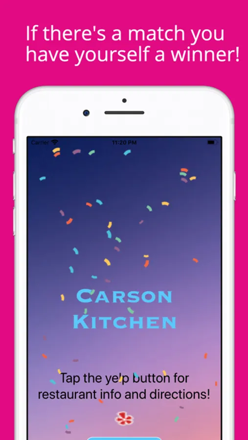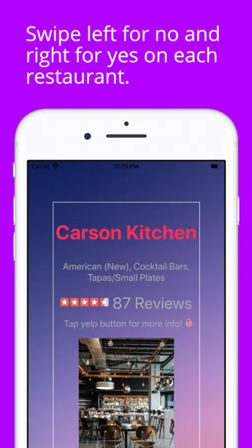 How the swiping works: 20 top rated restaurants will be displayed one at a time on your device. Swipe left on the restaurant if you don't want to eat there, and swipe right if you do.