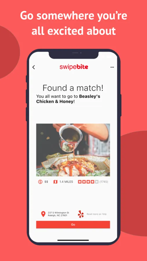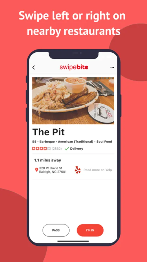 Swipebite solves those problems. You and your friends (or whoever you're going out to eat with) each swipe through nearby restaurants. When you all swipe right on the same one: that's where you're going.