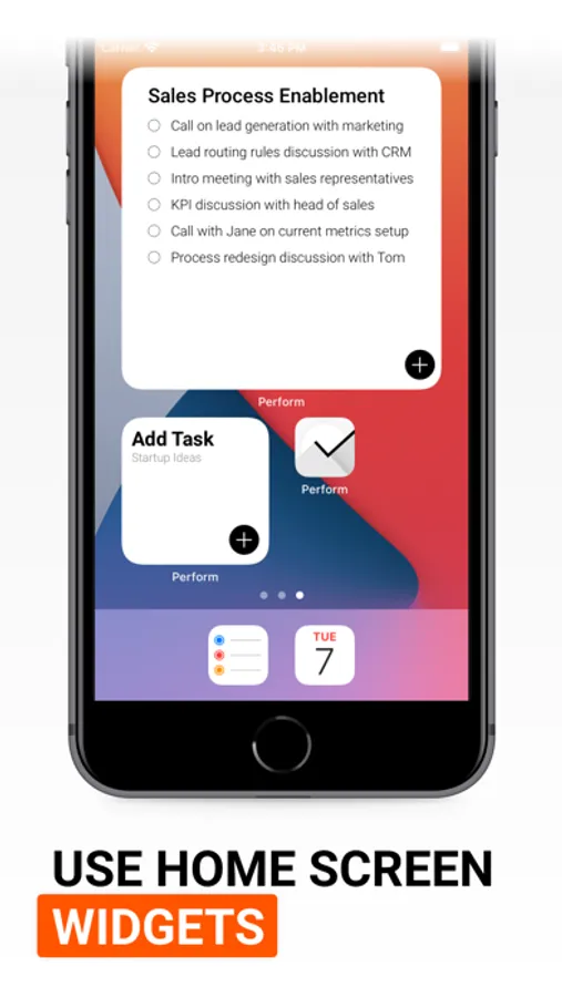 With Perform, you can add tasks the way you like: from the app, from home screen widgets, Siri, or quick app actions, by typing or with your voice.