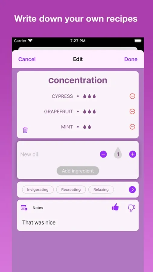 It is possible to add prescriptions for each recipe, such as mood or feel.