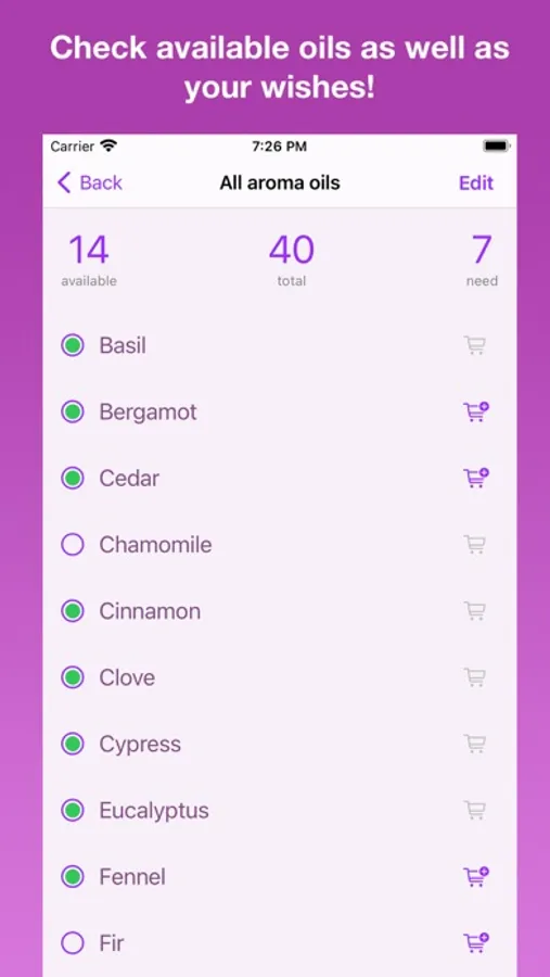 - A list of oils with a mark of those that are available and those that need to be purchased. Can be used as a shopping list!