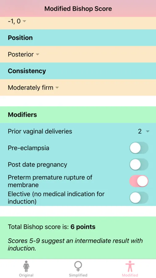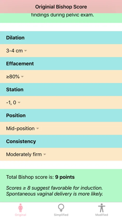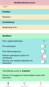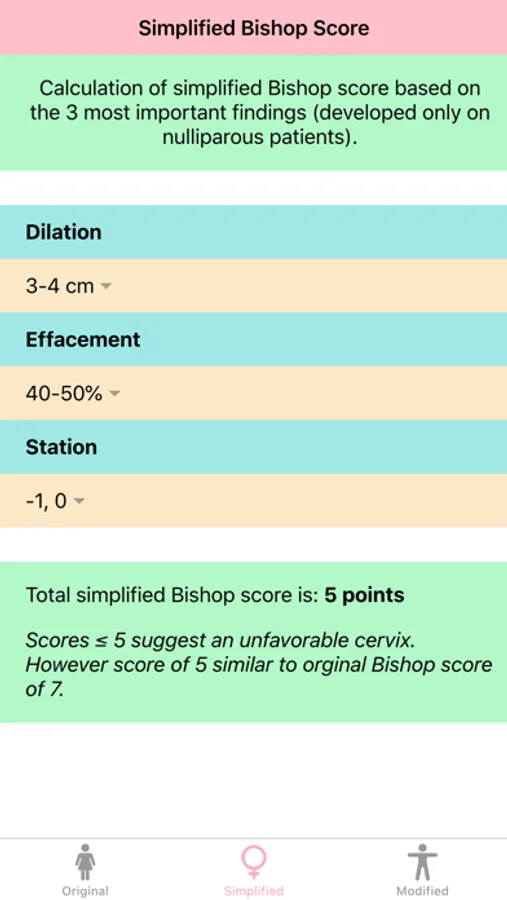 - Calculation of original Bishop score (1964), simplified Bishop score (Laughon, 2011), and modified Bishop score (Hughey, 1976)