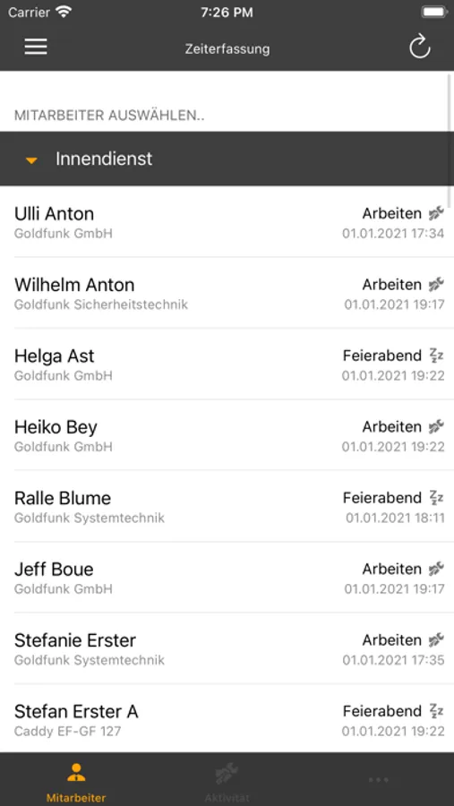 Applikation zur Arbeitszeiterfassung, Geräteverwaltung und Fahrzeugsicherheit für das Flottenmanagementsystem TCplus.
