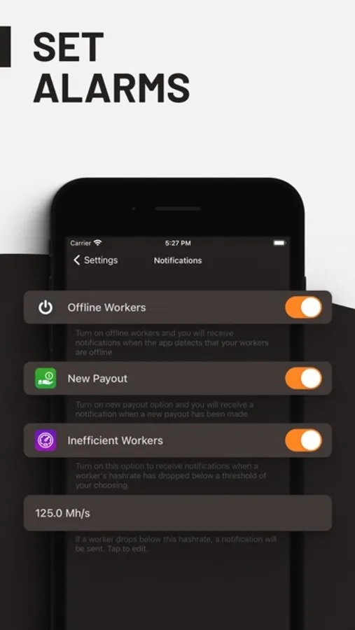 - receive notifications when a worker has gone below a hashrate of your choosing