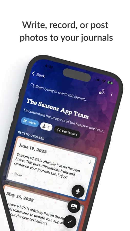 Seasons Journaling guides you through the seasons of life, helping you reflect deeply, grow spiritually, and stay grounded in a beautifully simple and organized way. Keep your thoughts, feelings, and notes organized in multiple journals. Make use of insightful prompts to keep you inspired, and gain clarity around your experiences with AI-powered reflections that analyze your recent journal entries. Stay motivated and accountable with mood charts and habit tracking calendars. Make journaling an indispensable part of your self care routine with features like positive affirmation notifications and calendar scheduling. Express your creativity with countless designs and stickers. Keep your journals private, or share your beautifully designed journal entries with the world.