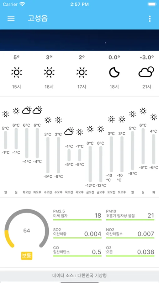 에어코리아(환경부 한국환경공단)의 데이터를 기반으로 각 지역의 미세먼지 오염도와 예보를 제공합니다.
