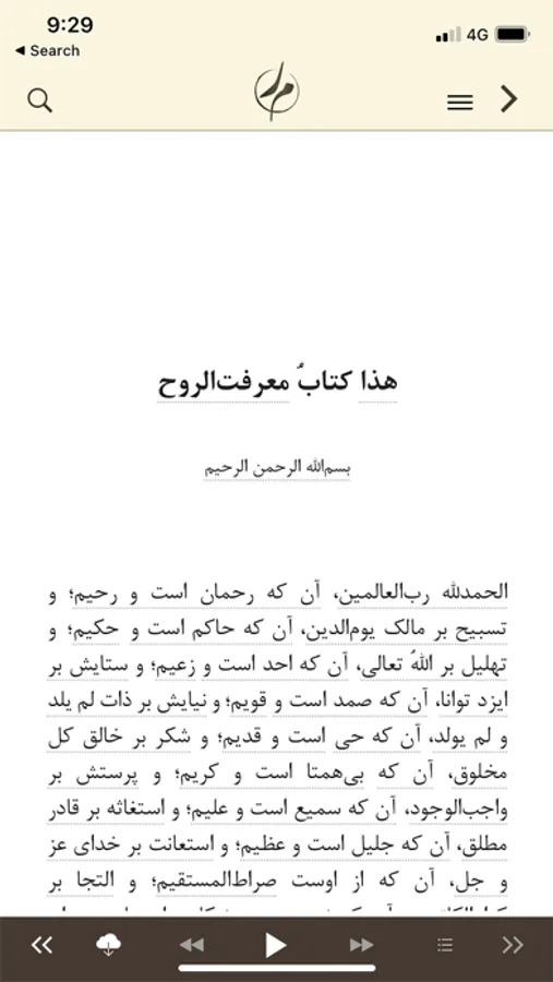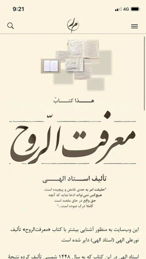 This app is intended to introduce and provide greater familiarity with the book Marefat ol-Ruh (Knowing the Spirit, 1969), the second published work of Nur Ali Elahi (later Ostad Elahi, 1895-1974). Marefat ol-Ruh represents the culmination of Ostad Elahi’s extensive theological and philosophical research, as well as his exploration of the various dimensions of the human spirit. Considered to be among his theoretical works, its publication in the second half of the 20th century suggests that Ostad Elahi was seeking to revive the discursive tradition of philosophical-theological discourse. The supplemental articles and expositions by other researchers and scholars in the field provide essential contextual background and additional analyses of Ostad Elahi’s findings.