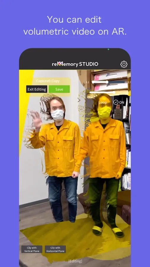 Rememory's volumetric video can be easily edited in AR. Create your original spatial video by cloning yourself, playing back time, or cropping a part of the video.