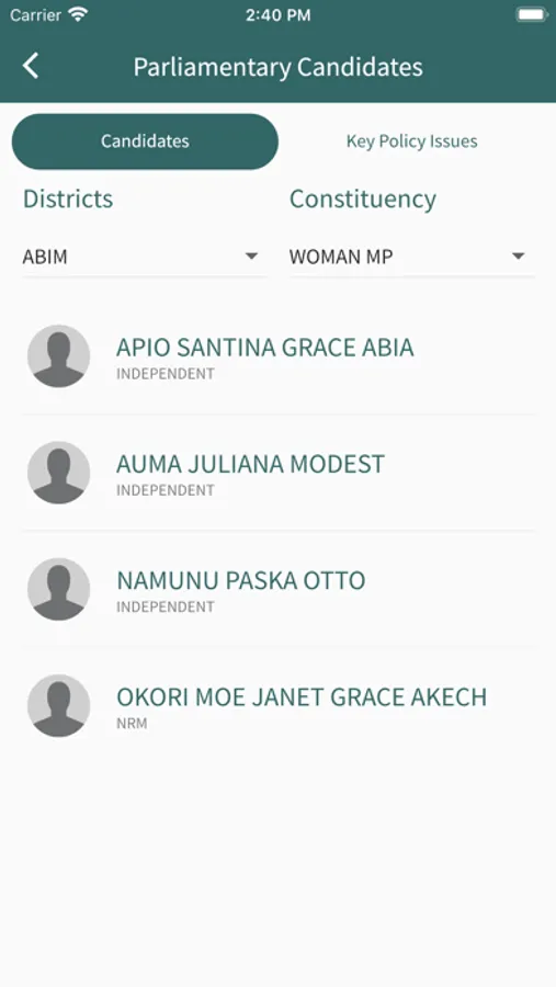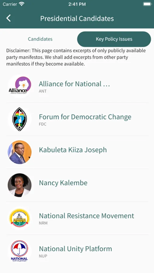 **DISCLAIMER: The material on this application is provided for general information only, and is mainly collected from three sources: The Electoral Commission, Candidate's websites, and results.ug. Candidates' profiles & manifestos are sourced from their platforms, and we aim to be unbiased in every way. In case of any errors, we shall modify the contents of this application as soon as possible.