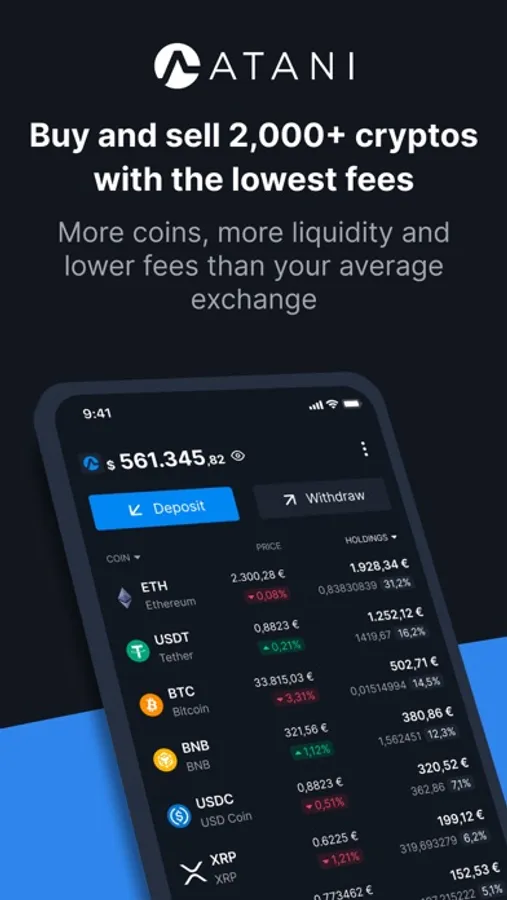 Trusted by over 300,000+ traders around the globe since 2019, Atani is a European-based and regulated company that enables you to securely buy and sell Bitcoin, Ethereum and thousands of other promosing altcoins at the best price and with the lowest trading fees. In short:
