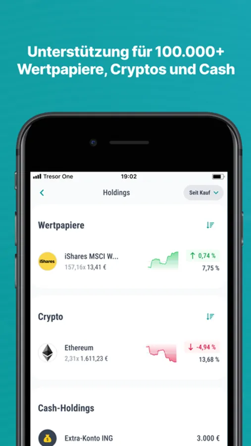 Dank der Cloud-Synchronisierung hast du jederzeit und von überall Zugriff auf deinen Vermögensstand - ob unterwegs auf dem iPhone, zu Hause am Laptop oder auf der Arbeit im Browser.