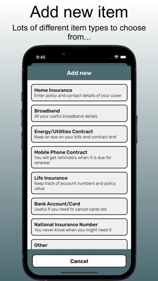 • It keeps a record of all your documents including insurance, energy bills, car servicing, passports, bank details and much more...