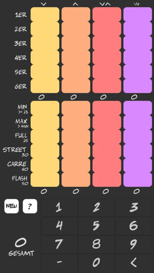 You need five real physical dices. Each player can throw three times to collect some combinations. Fill the first column from top to bottom, the second vice versa, the third as you like and the last only with a single throw.