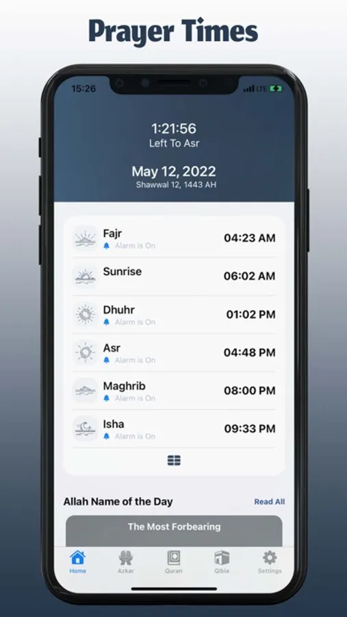 - يتم عرض وقت الصلوات مع الوقت المتبقي للأذان.
