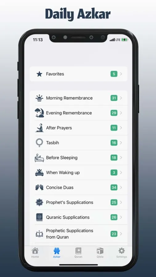 - Each prayer time is displayed as well as how much time is left to the next Azan time.