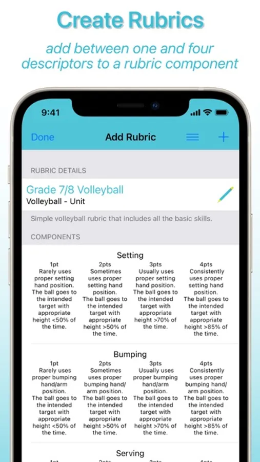 - Option to purchase pre-made rubrics within the app as in-app purchases.