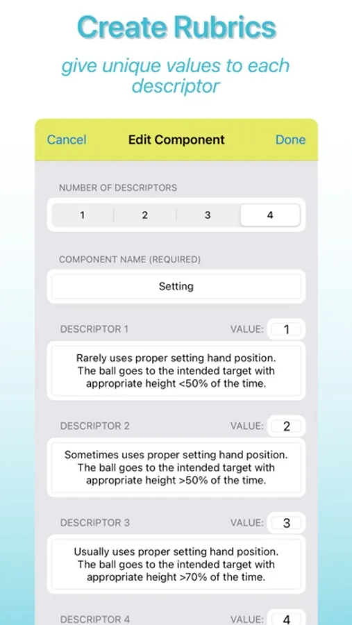 - Create, edit, duplicate rubrics with 1-4 descriptors per component with unique values.