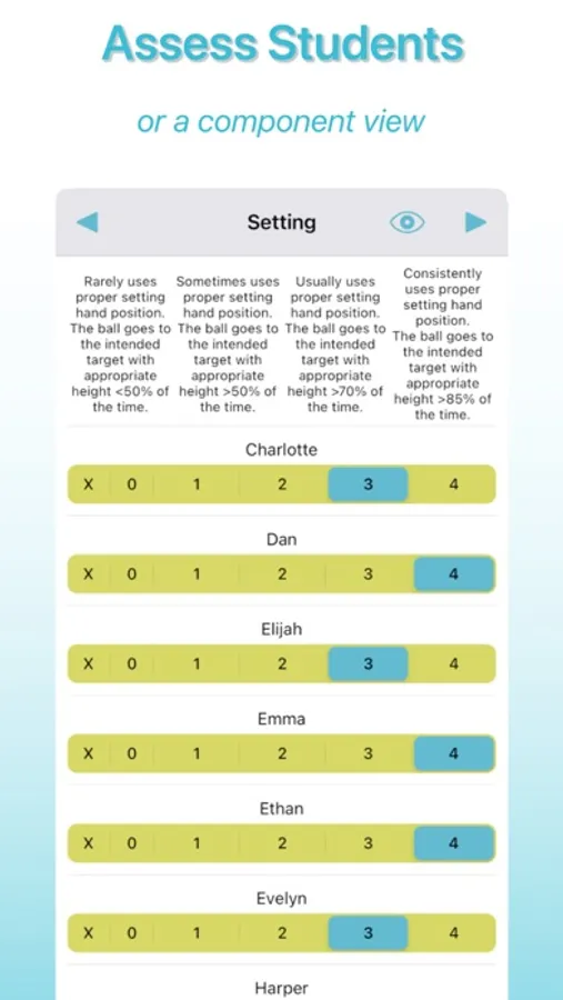 - Assess a class using the component view to view all students at once to assess a single component.