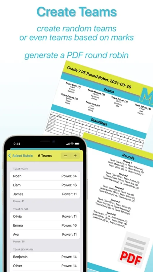 - Generate a PDF round robin schedule based on created teams.