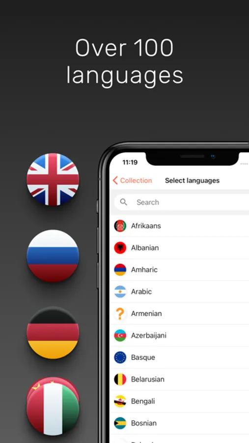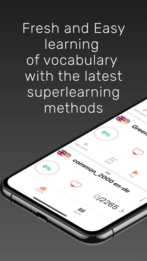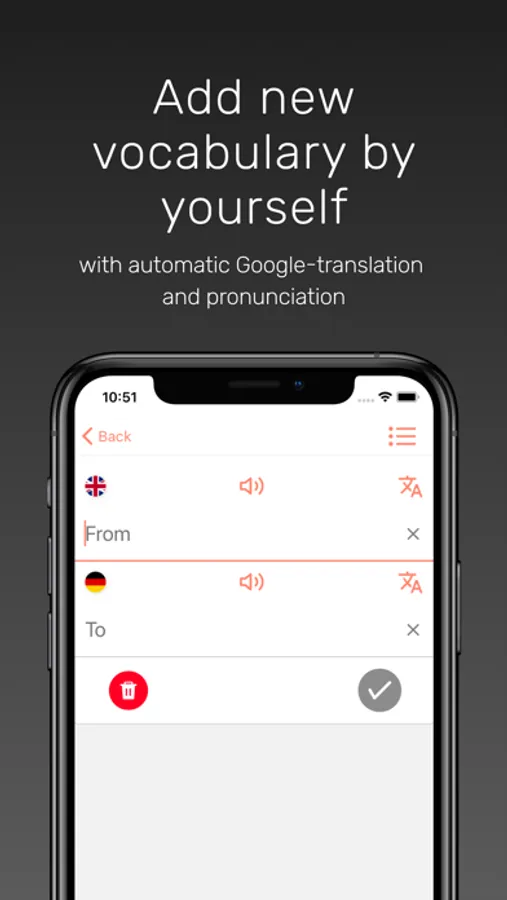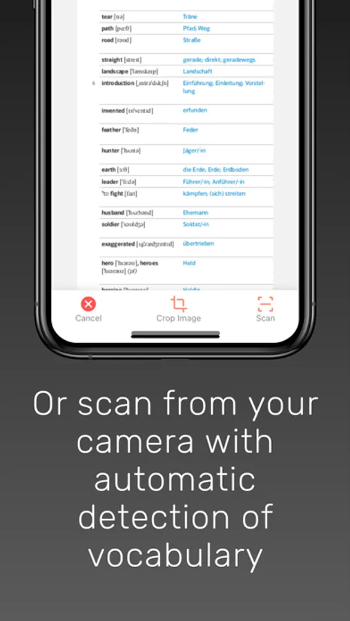 Scan: You can also scan the vocabulary from your language book. Handwriting is also recognised. Use the camera function of your mobile phone or load a photo from the photo library. Select the area with the foreign words and the translation. If the recognition does not fit exactly, you can change the recognised word immediately and save it.