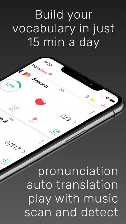In the "Check", 15 random vocabulary words are selected for testing. If the heart is filled up, it means that you have practised the vocabulary every day. Your progress is shown as a percentage. Or as a number 12/24 (done/open).