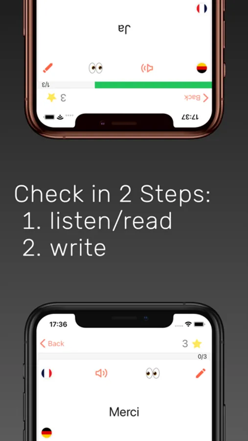 If you get the word wrong, it will be repeated at the end. With 6 stars, the word is stored in the long-term memory and classified as learned. The word is then no longer used for testing.