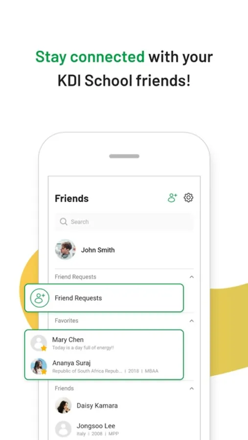 그 외 다양한 기능 : 프로필 사진을 업로드하고, 다양한 카테고리에 따라 친구를 찾고, KDI School과 연락을 유지하고, 학교 행사에 참여하는 등의 작업을 수행하세요!