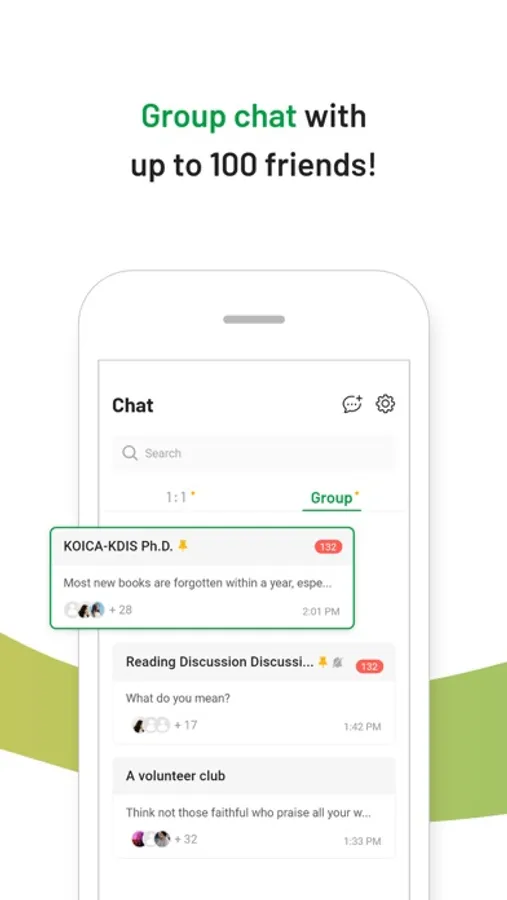 그룹 채팅 : KDI 학교에는 KOICA, 학생 포럼 그룹, 동창 그룹 등 많은 그룹이 참여할 수 있습니다! KDI 스쿨에서 공부하는 동안 참여했던 그룹과 연락을 유지하십시오. 이 앱을 사용하면 최대 100 명의 사용자와 그룹 채팅을 통해 그룹 구성원과 쉽게 연락 할 수 있습니다.