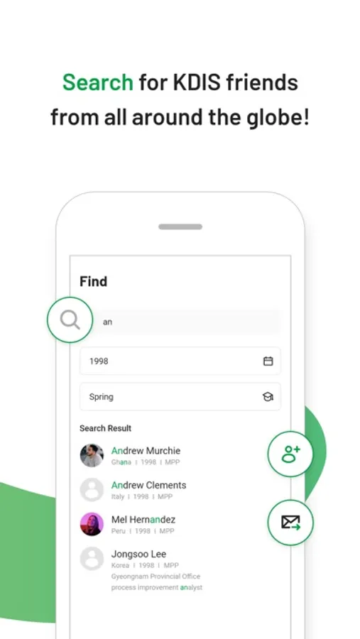 이름, 국가, 입학 연도, 학업 프로그램, 직종, 직장, 직위로 친구를 검색하고 대화를 시작할 수 있습니다. KDIS_connect는 동문 네트워크와 연결하는 완벽한 방법입니다!