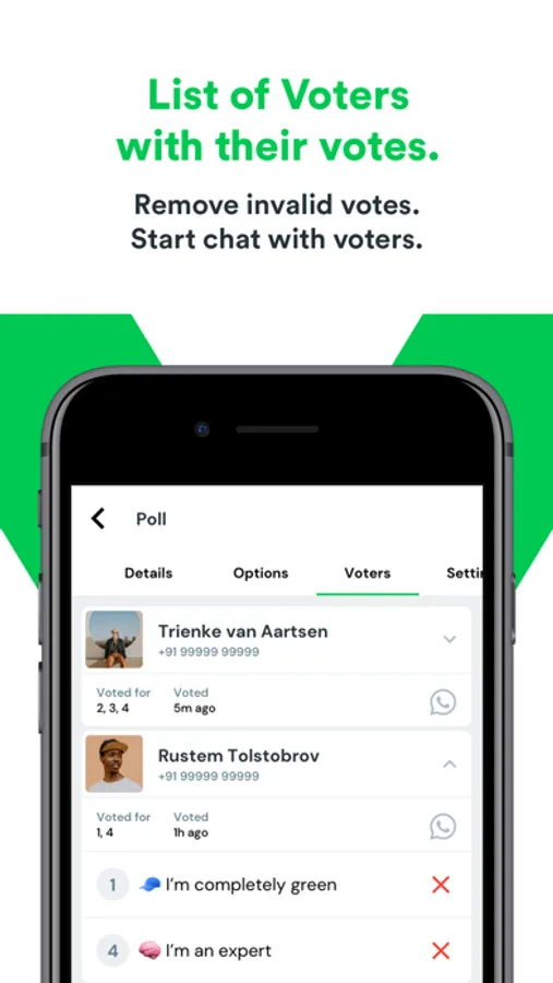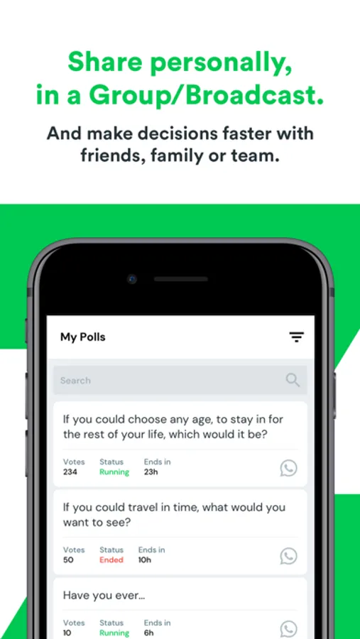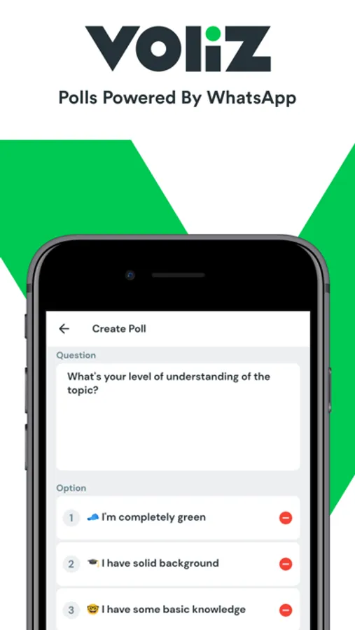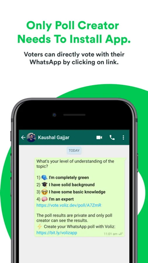 Voliz is a polling app that helps you create polls or surveys on WhatsApp. Share them with your Contacts, Groups, Broadcast Lists, or friends and get their opinions in a fast and simple way on WhatsApp only. The poll creator has to download the app, but voters can directly vote from their WhatsApp.