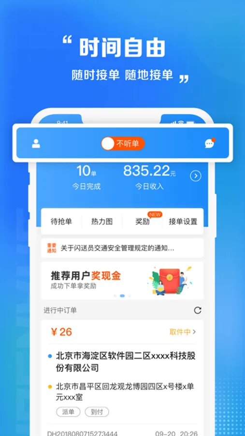 业余时间兼职配送的赚钱APP,帮助人们利用业余时间在闪送服务中高效接件、送件的赚钱工具。