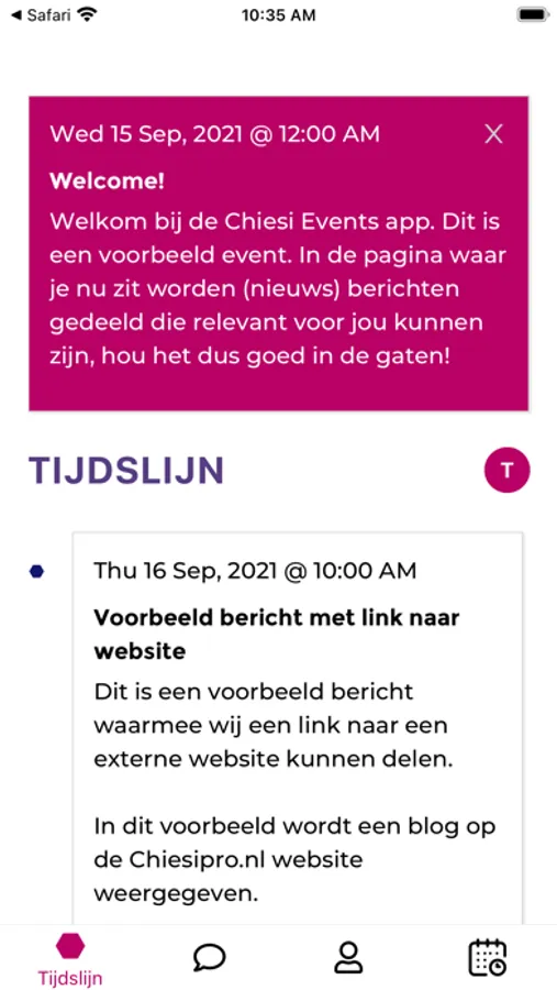 Met de Chiesi Events app heeft u alle relevante informatie rond een event of congres binnen handbereik. Zo bent u altijd op de hoogte van het actuele programma en de locaties, blijft u in contact met andere deelnemers en kunt u vragen stellen aan uw Chiesi contactpersoon.