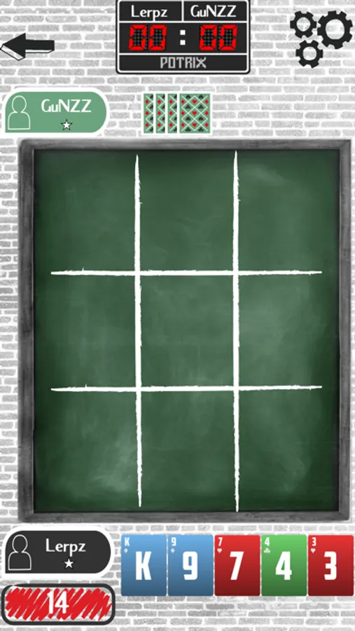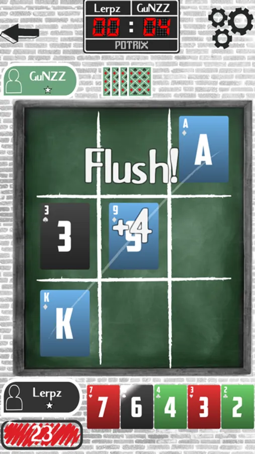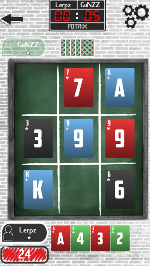 The goal of the game is to complete 3 card poker hands against a similarly ranked opponent. You can complete hands using the Tic-Tac-Toe board horizontally, vertically and diagonally. You receive points according to the poker value of the three card hand you make. The round continues until all spots are occupied on the board. The match continues until a player reaches the desired number of points. Players receive points according to the final score and move up the leaderboard and qualify for the star ranks.