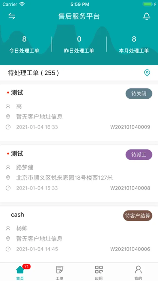 实时查看服务人员的当前位置、行程轨迹及工单的完成进度。