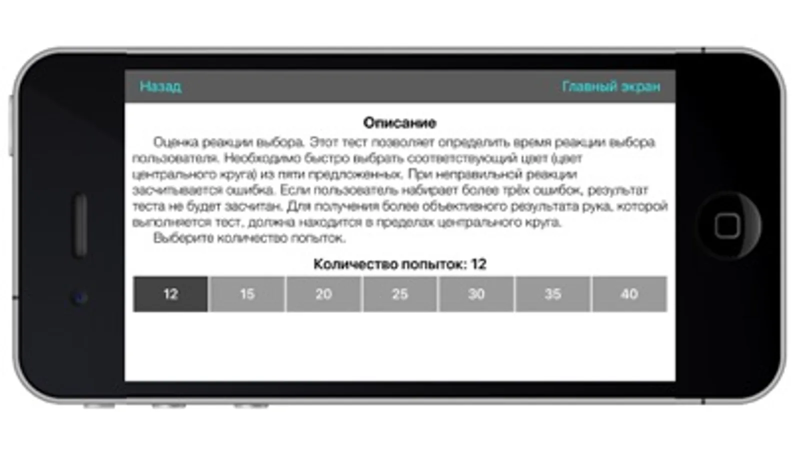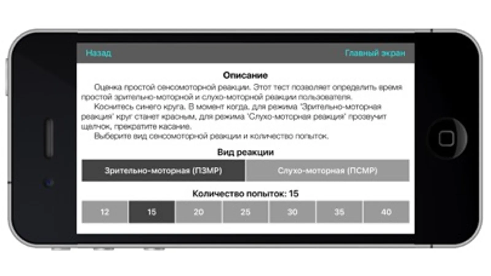 A set of tests for assessing sensorimotor reactions (simple visual-motor and hearing-motor reactions, choice reaction, reaction to a moving object, sense of pace, discrimination reaction). The application is intended for athletes, coaches and anyone who is interested in the features of the manifestation of sensorimotor reactions in various activities.