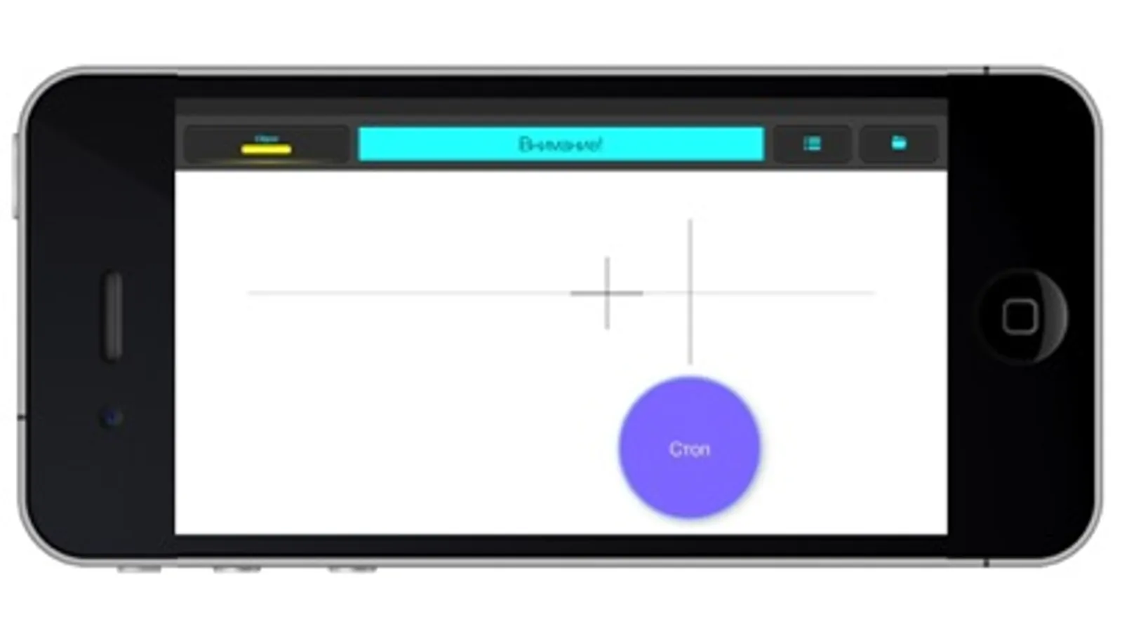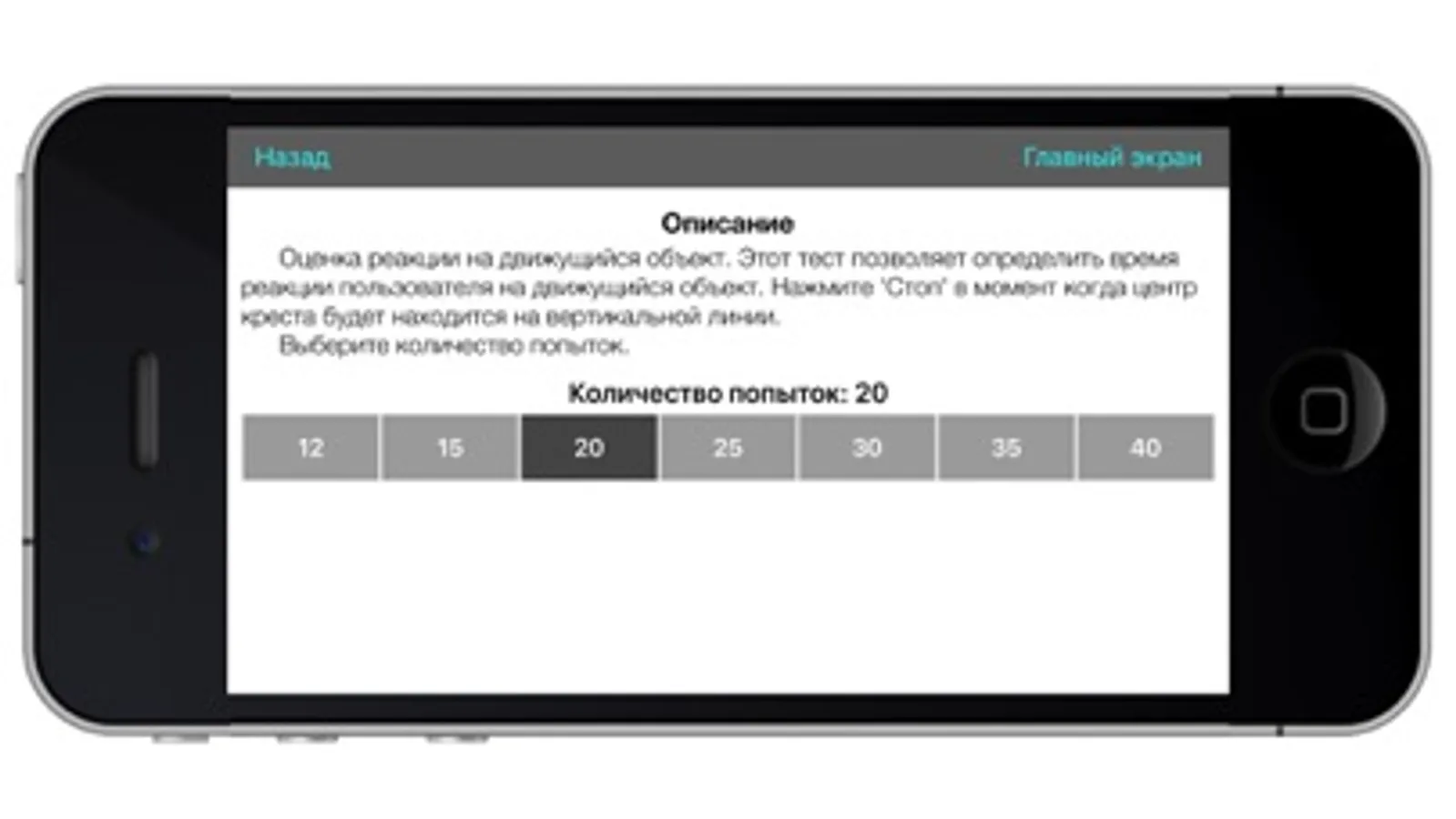 This test allows you to determine the user's reaction time to a moving object. Press "Stop" at the moment when the center of the cross is on the vertical line.