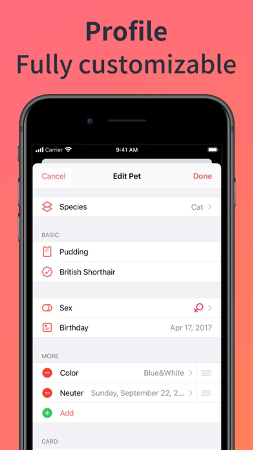 AnyPets supports adding multiple pets, so you won't worry about missing any of your pet pals. You can choose your favorite pet photo as the card cover to distinguish each pet more easily.