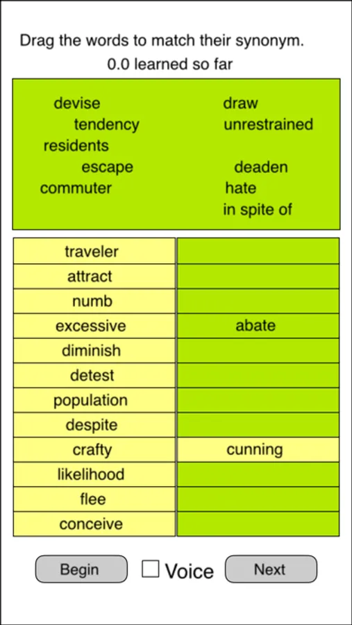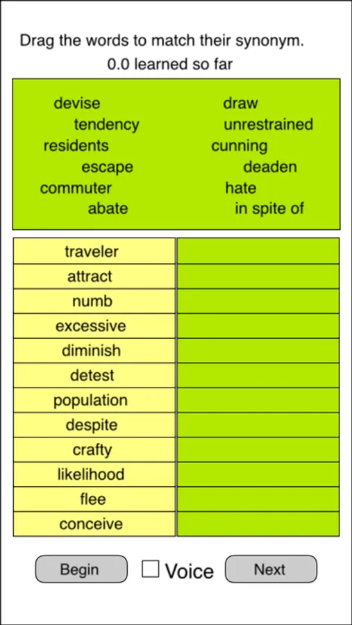 Synonym List helps you learn English synonyms. It's simple, just match the words by dragging them together.