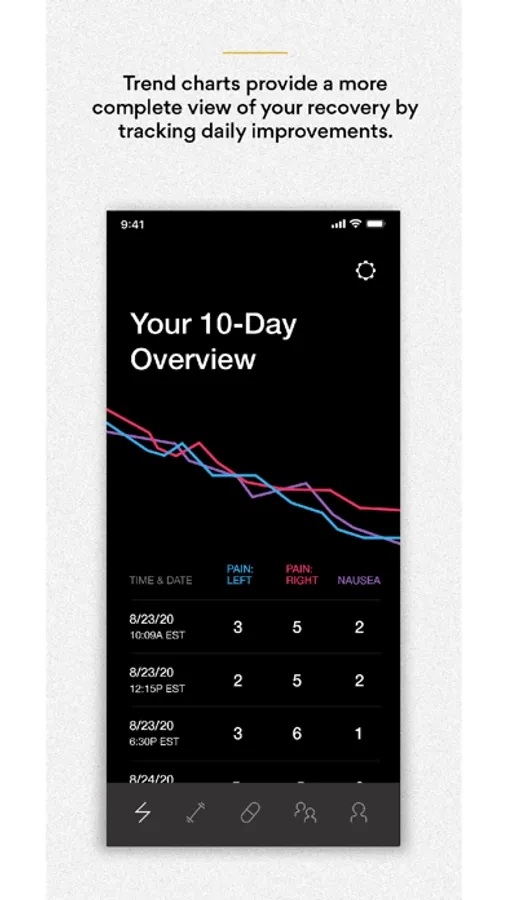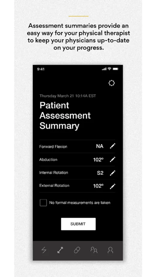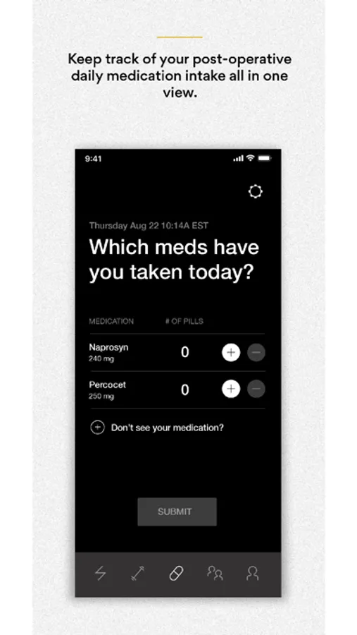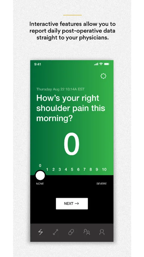 Ortho Patient mobile app enables patients to report post-surgical outcomes and track progress for their surgeon to see. Patients are invited to the app before surgery and report pain, nausea, medication usage, and physical therapy assessments.